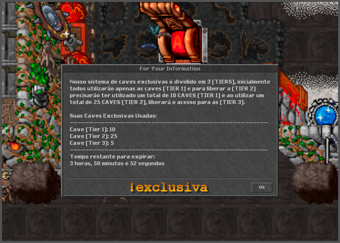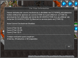 Para melhor balanceamento e evitar jogadores que só upam dentro da cave exclusiva, você só conseguirá utilizar 1 cave a cada 12h, totalizando 2 por dia. Isso faz com que os jogadores tenham um lugar seguro para upar por 4h, mas impossibilitando que os mesmos sejam charlover e só upem na exclusiva.